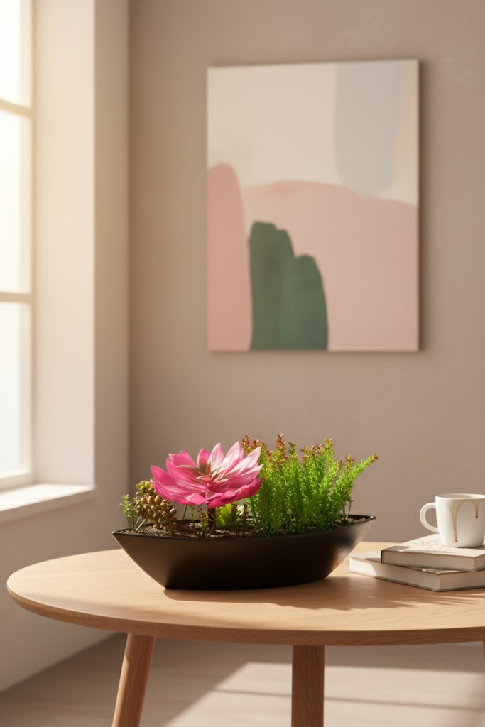Unesite svežinu i stil u svoj dom uz unikatni dekorativni aranžman u obliku brodića sa veštačkim cvećem. Ovaj pažljivo izrađen komad sadrži kombinaciju realističnih sukulenata i zelenila, aranžiranih u modernoj keramičkoj posudi koja podseća na elegantan brodić.