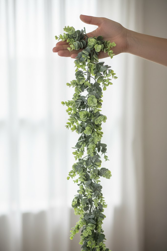 Izrađena od kvalitetnih materijala, ova dekorativna visilica ima realistično oblikovane listove i bogatu strukturu koja unosi svežinu u svaku prostoriju. Na vrhu ima praktičnu kuku koja omogućava lako kačenje na zid, plafon ili konstrukciju za biljke.